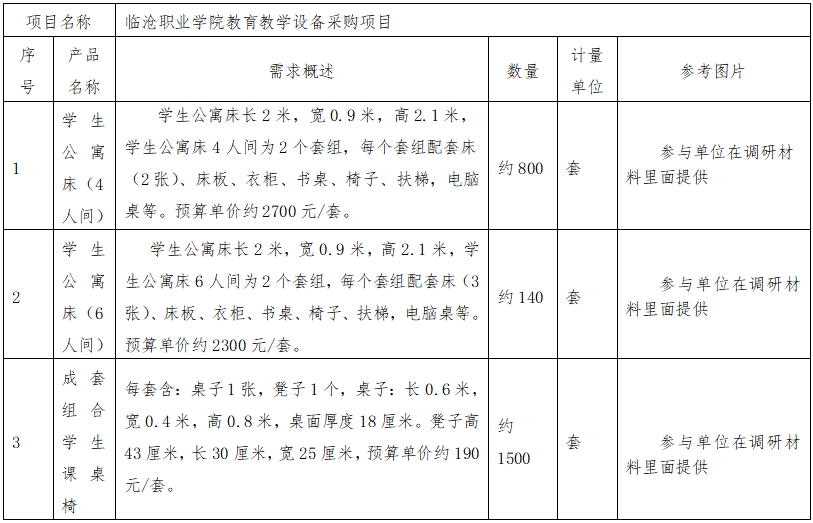 根据《中华人民共和国政府采购法》、《政府采购需求管理办法》等有关规定,PP电子游戏网站拟对新采购学生公寓床、课桌椅等物资发布采购前期市场调研征集公告,欢迎具备资质、有意向的单位参与,并提供市场调研材料。